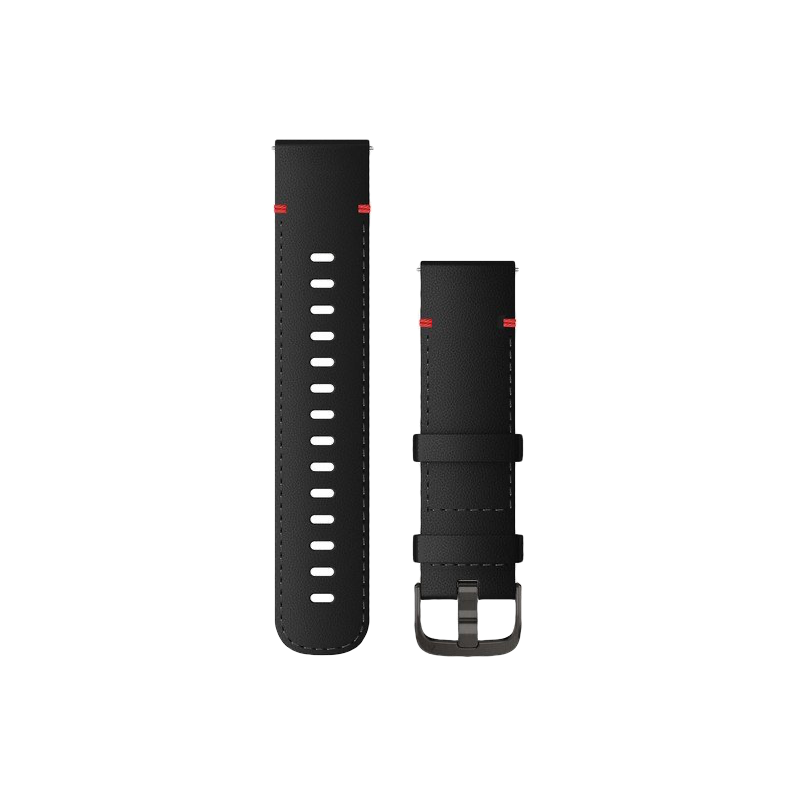 Sort Garmin 22mm skinnrem med hurtigkobling og skifergrå spenne. Remmen har røde og sorte sømmer. Passer alle vìvo- og Legacy 22mm modeller