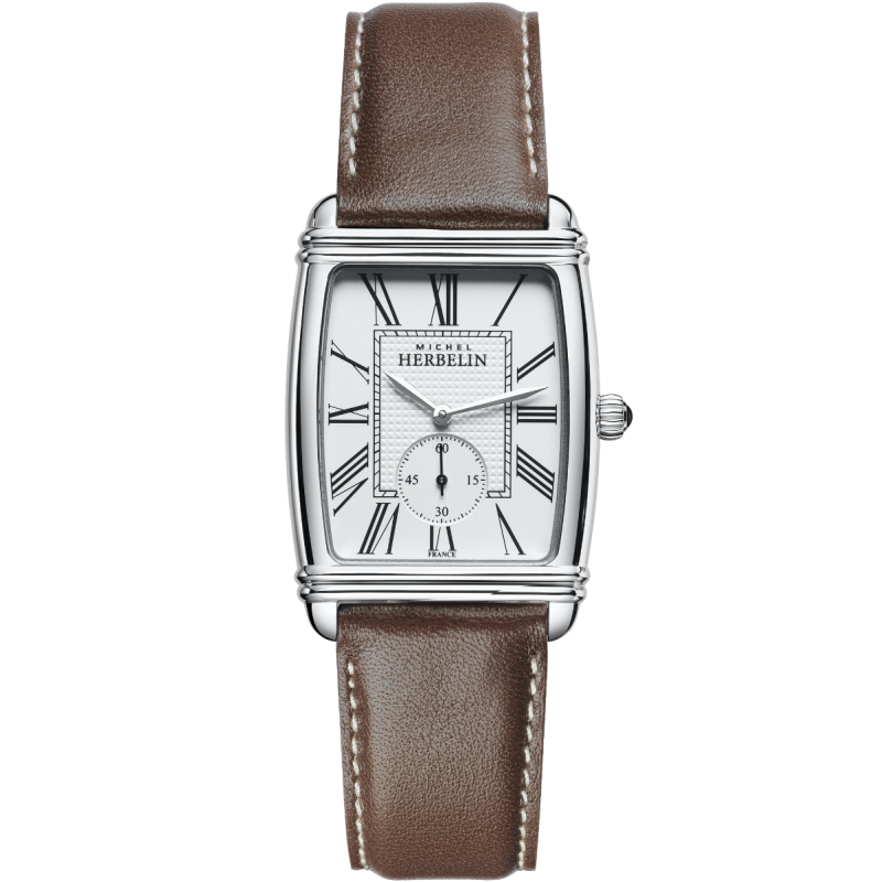 Michel Herbelin Art Déco armbåndsur, 30x35,5 mm, stål, brun skinnrem med klassisk spenne, hvit urskive med romertall og sølv visere, liten sekundviser, sveitsisk quarts urverk, safirglass, 5 bar