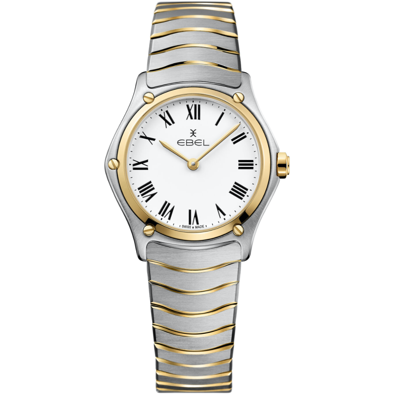 Ebel Sport Classic armbåndsur til dame, 29 mm, stål og 18K gull, lenke med foldespenne, gull bezel med skruer, hvit skive med romertall og gyldne visere, sveitsisk quarts urverk, safirglass, 5 bar