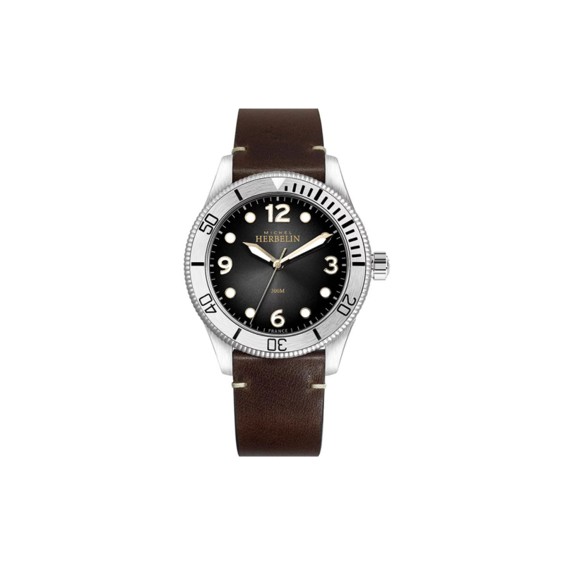 Herbelin Trophy 42 mm dykkerklokke til herre med brun skinnrem og klassisk spenne. Klokken kommer med en dreibar bezel og sort skive med gyldne Super-LumiNova® indekser og visere. Klokken drives av et quartzverk og vanntett ned til 300 meter.