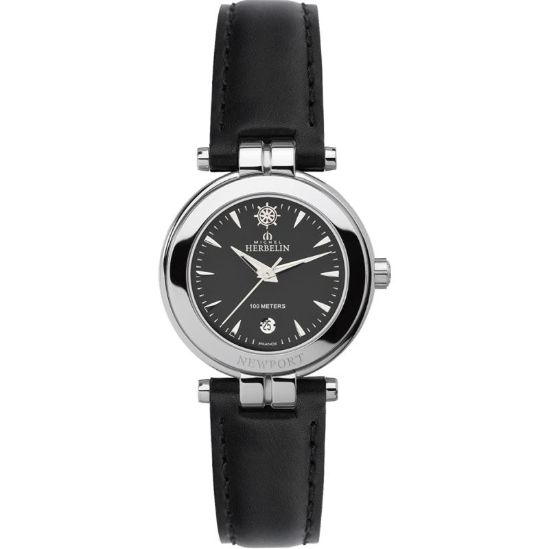 Michel Herbelin Newport Yatch Club armbåndsur til dame, stål, sort skinnrem, sort skive med sølv visere, sveitsisk quartz urverk, dato, safirglass