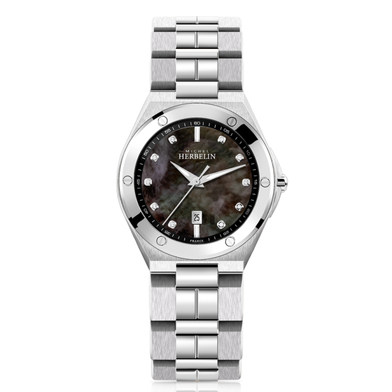 Michel Herbelin Cap Camarat armbåndsur til dame, 34,5 mm, stål lenke med foldespenne, polert bezel med skruer, sort perlemorskive med 10 diamanter og sølv visere med Super-LumiNova®, sveitsisk quartz-urverk, dato, safirglass, stål baklokk, 10 bar