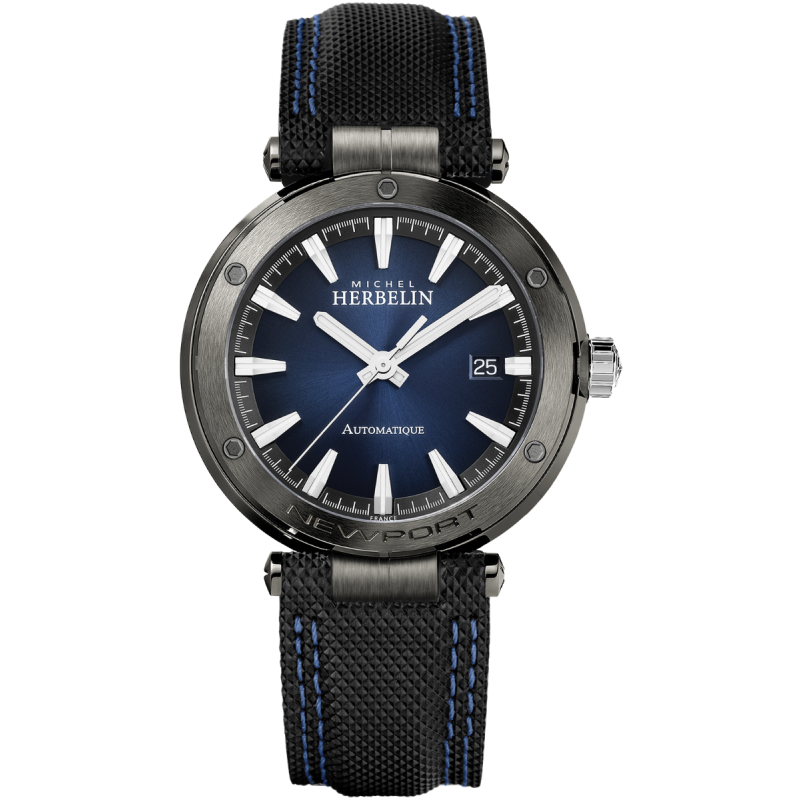 Michel Herbelin Newport armbåndsur til herre, 41 mm, stål med sort PVD, sort tekstilrem med klassisk spenne, børstet bezel med skruer, blå skive med sølv indekser og visere med Super-LumiNova®, automatisk urverk, dato, safirglass,, 10 bar