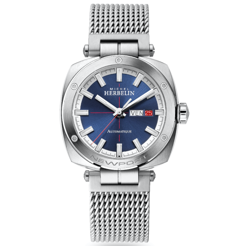 Michel Herbelin Newport Heritage armbåndsur til herre, 42x42 mm, stål, mesh-lenke med foldespenne, børstet stål-bezel med skruer, blå skive med røde krysshår sølv indekser og visere, automatisk urverk, dag, dato, safirglass, glass baklokk, 10 bar