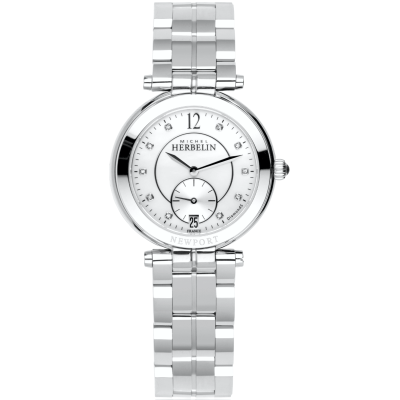 Michel Herbelin Newport Classics armbåndsur til dame, 34 mm, stål, lenke med foldespenne, polert stål bezel, lys perlemorskive med 10 diamanter og sølv visere, sveitsisk quarts urverk, dato, safirglass, stål baklokk, 5 bar