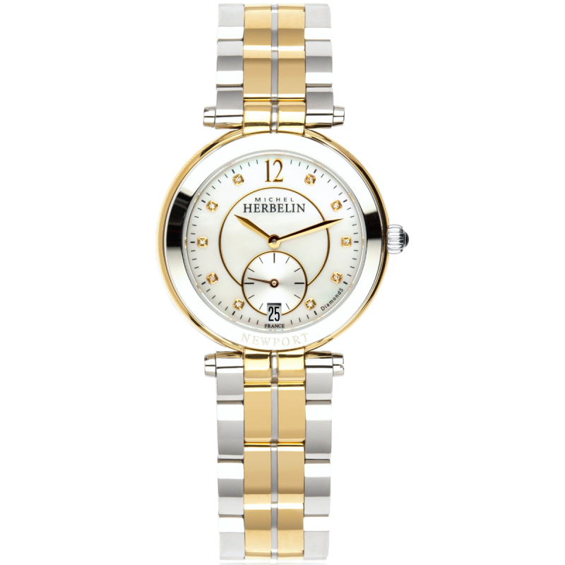 Michel Herbelin Newport Classics armbåndsur til dame, 34 mm, stål og gull PVD, lenke med foldespenne, polert stål bezel, lys perlemorskive med 10 diamanter og gyldne visere, sveitsisk quarts urverk, dato, safirglass, stål baklokk, 5 bar