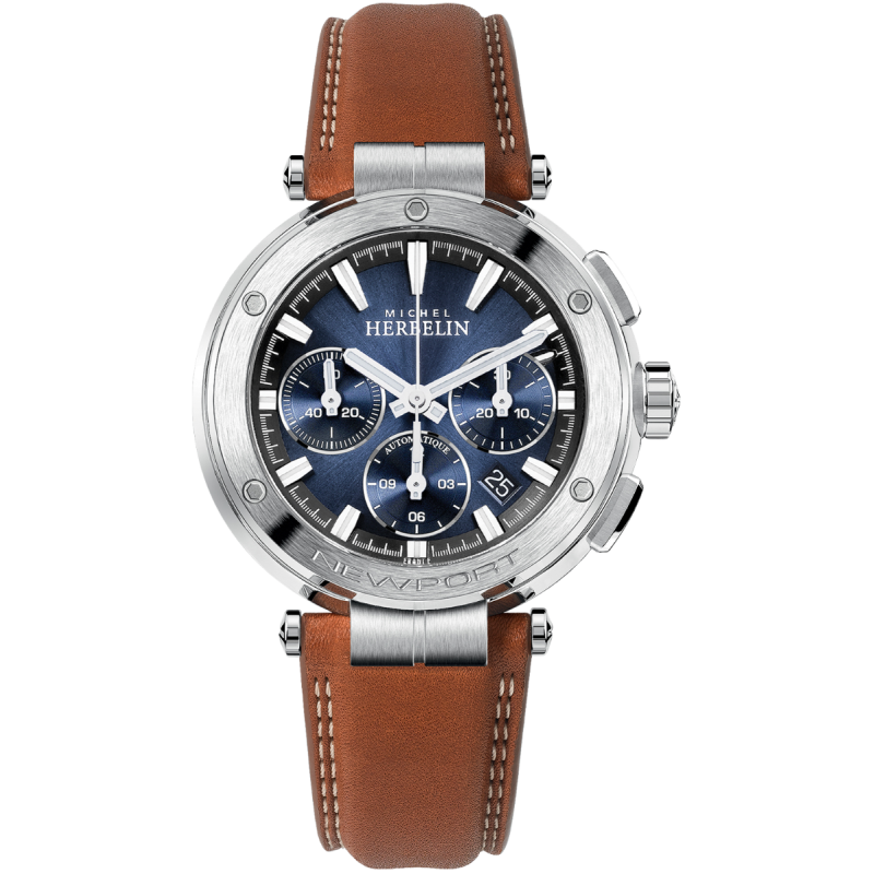 Michel Herbelin Newport armbåndsur til herre, 43,5 mm, stål, brun skinnrem med foldespenne, børstet stål bezel med skruer, blå skive med sølv indekser og visere med Super-LumiNova®, automatisk urverk, stoppeklokke, dato, safirglass, 10 bar