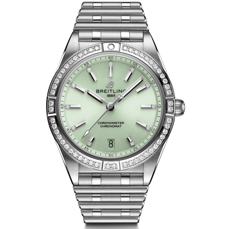 Breitling Chronomat armbåndsur til dame, 36 mm, stål, rouleauxlenke med foldespenne, diamantbesatt bezel, grønn skive med sølv indekser og visere, automatisk Breitling Caliber 10 urverk, dato, safirglass, stål baklokk, 10 bar 2 år garanti Ref. A10380591L1A1