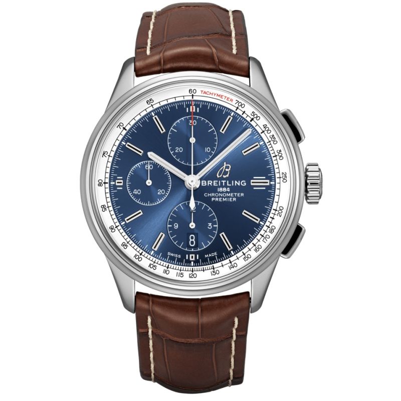 Breitling Premier armbåndsur til herre, 42 mm, stål, krodkodille skinnrem med klassisk spenne, blå og hvit skive med sølv Super-LumiNova® visere, automatisk Breitling 13 verk, 48 timer gangreserve, stoppeklokke, dato, buet safirglass med tosidig antirefleksbehandling, 10 bar