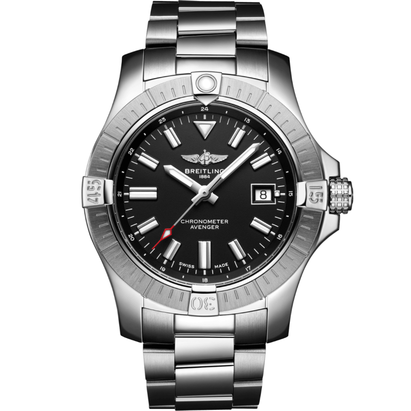 Breitling Avenger armbåmndsur til herre, 43 mm, stål, lenke med foldespenne, dreibar bazel, sort skive med sølv Super-LumiNova® visere, automatisk Breitling cal. 17 verk, 38 timer gangreserve, dato, buet safirglass med tosidig antirefleksbehandling, 30 bar