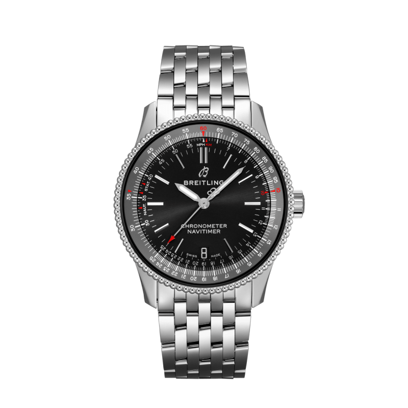 Breitling Navitimer armbåndsur, 38 mm, stål, lenke med foldespenne, sort skive med sølv Super-LumiNova® visere og røde detaljer, automatisk Breitling cal 17 verk, 38 timer gangreserve, dato, buet safirglass med tosidig antirefleksbehandling, 3 bar