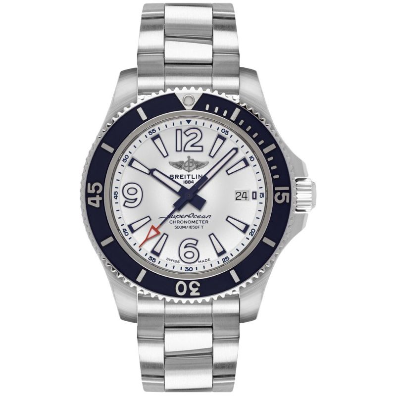 Breitling Superocean, 42 mm. Automatisk, selvtrekkende. 500 meter vanntetthet. 38 timers gangreserve. Ripebeskyttet safirglass.Hvit med selvlysende markerer arabiske siffer og indeksmarkeringer, selvlysende visere. Urverk med 25 juveler, 28800 vph.