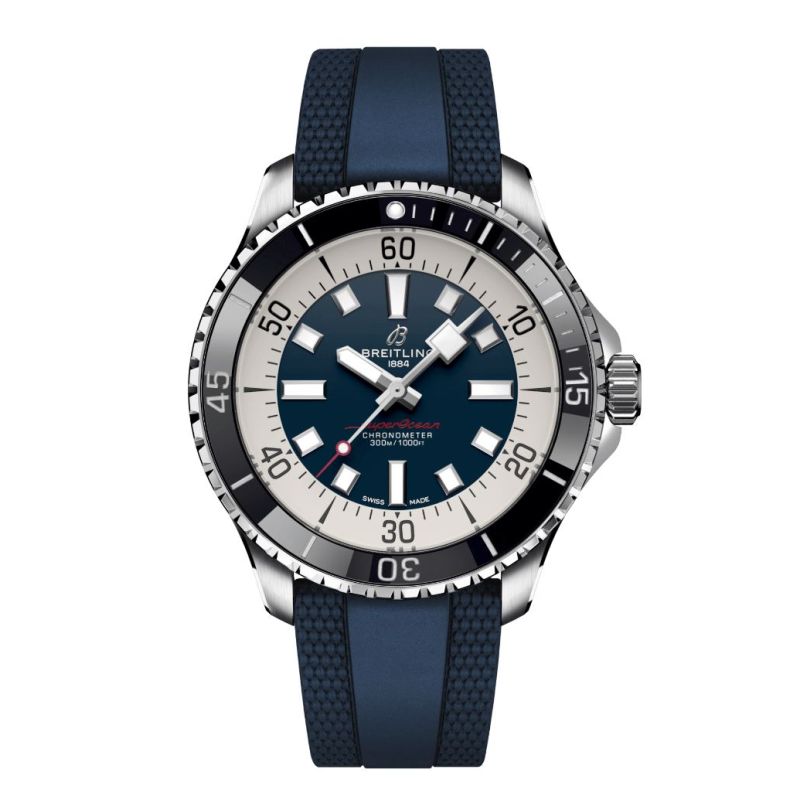 Breitling Superocean Automatic 44 Stainless Steel - Blue. Brede visere og indekser i selvlysende Super-LumiNova® gir enkel lesbarhet under vann. Klokken er vanntett ned til 300 m (1000 fot), i tillegg til å være støt-, sand- og saltvannsbestandig. Urverket i klokken er Calibre Breitling 17. Klokken er i rustfritt stål og kommer med blå gummireim. Kan brukes til alt; surf med den, svøm med den, bruk den ute, og bruk den til middag.