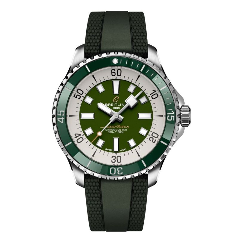 Breitling Superocean Automatic 44 Stainless Steel - Green. Brede visere og indekser i selvlysende Super-LumiNova® gir enkel lesbarhet under vann. Klokken er vanntett ned til 300 m (1000 fot), i tillegg til å være støt-, sand- og saltvannsbestandig. Urverket i klokken er Calibre Breitling 17. Klokken er i rustfritt stål og kommer med grønn gummireim. Kan brukes til alt; surf med den, svøm med den, bruk den ute, og bruk den til middag.