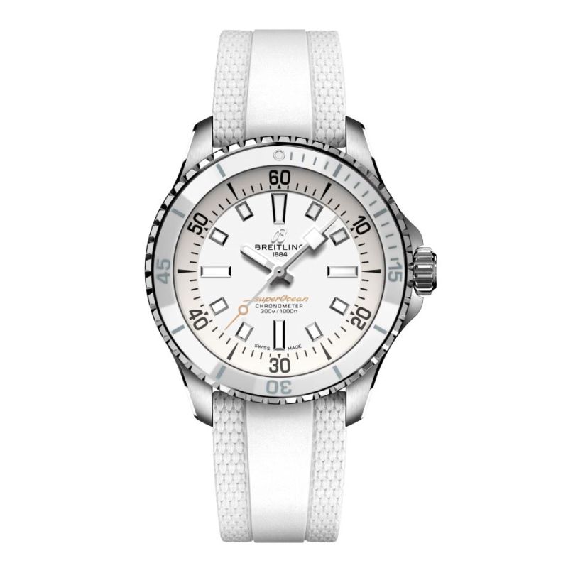 Breitling Superocean Automatic 36 Stainless Steel - White. Brede visere og indekser i selvlysende Super-LumiNova® gir enkel lesbarhet under vann. Klokken er vanntett ned til 300 m (1000 fot), i tillegg til å være støt-, sand- og saltvannsbestandig. Urverket i klokken er Calibre Breitling 17. Klokken er i rustfritt stål og kommer med hvit gummireim. Kan brukes til alt; surf med den, svøm med den, bruk den ute, og bruk den til middag.