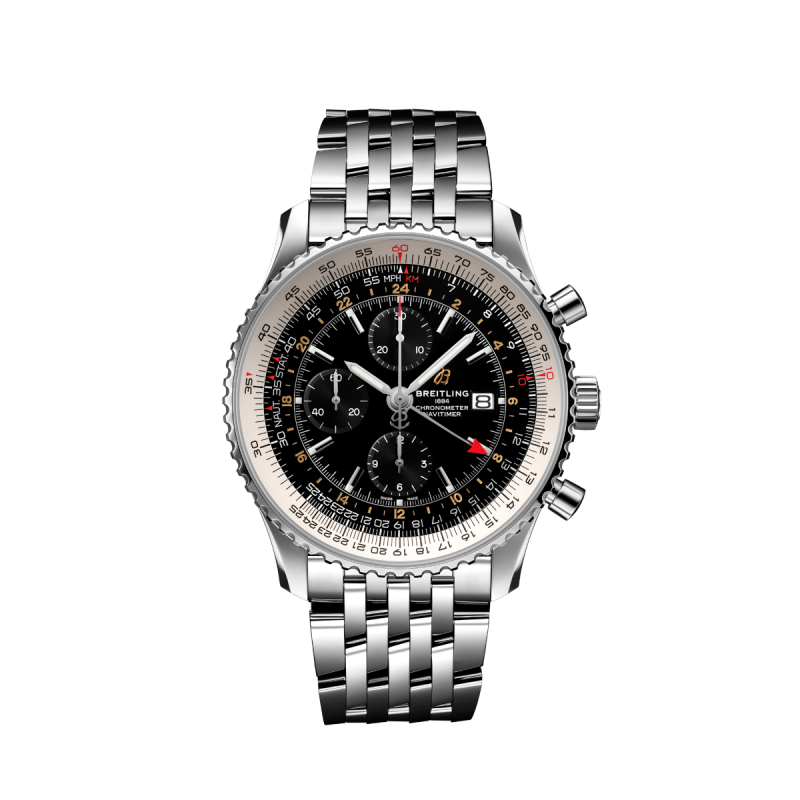Breitling Navitimer armbåndsur til herre, 46 mm, stål, lenke med foldespenne, sort og hvit skive med sølk Super-LumiNova® visere og røde detaljer, automatisk Breitling cal. 24 verk, 42 timer gangreserve, GMT-funksjon, dato, buet safirglass med tosidig antirefleksbehandling, 3 bar