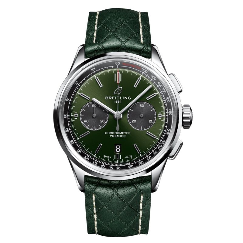 Breitling Premier for Bentley armbåndsur til herre, 42 mm, stål, grønn skinnrem med foldespenne, "British Racing Green" skive med sølv Super-LumiNova® visere, automatisk Breitling B01 manufaktur verk, 70 timer gangreserve, stoppeklokke, dato, safirglass med tosidig antirefleksbehandling, 10 bar, glass baklokk