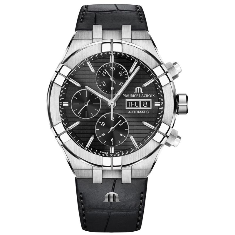 Maurice Lacroix Aikon armbåndsur til herre, 44 mm, stål, sort skinnrem med foldespenne og hurtigkobling, sort skive med Super-LumiNova®-visere, atomatisk ML112 verk, stoppeklokke, 48 timer gangreserve, dag- og datovisning, safirglass, 20 bar