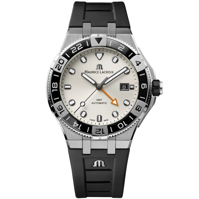 Maurice Lacroix Aikon Venturer GMT klokke til herre, 43 mm, stål, sort gummirem med foldespenne, dreibar bezel, hvit urskive med sorte indekser og visere med Super-LumiNova®, automatisk ML 165 urverk, GMT funksjon, dato, safirglass, dekorert baklokk, 30 bar