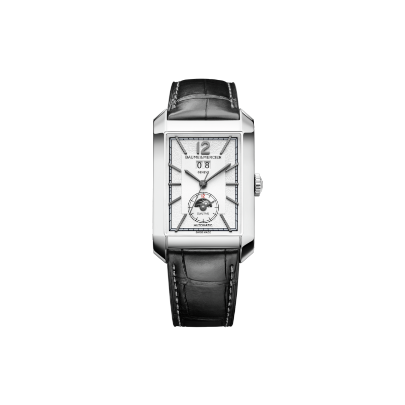 Baume & Mercier Hampton 10523 er et rektangulært og klassisk armbansur til herre som har en størrelse på 48mm x 31mm. Dette er et automatikkur, og kommer med en sort skinnrem i alligatorlær. Den sølvfargede urskiven har datovisning klokken 12 og GMT/sekundær tidssone. Vanntett ned til 50 meter.