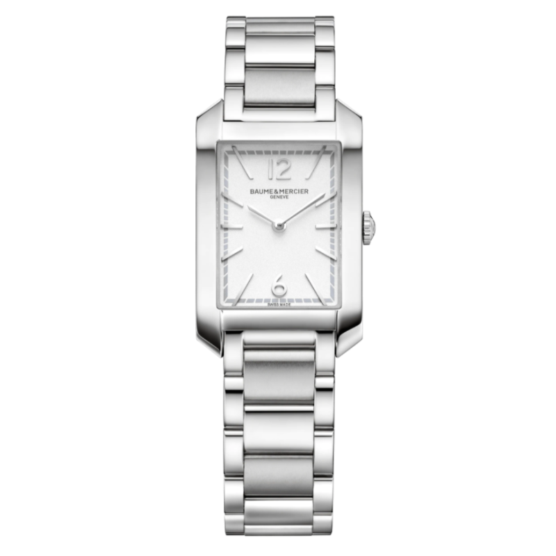 Baume & Mercier Hampton 10473 er et rektangulært, klassisk og elegant armbandsur til til dame. 22cm*35mm stålkasse, hvit urskive med sølvfargede visere og indekser, stållenke, 5 bar.