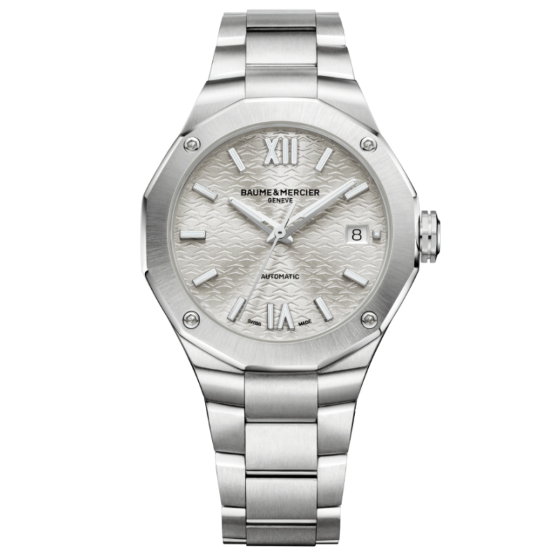 Baume & Mercier Riviera 10615 er et automatikk-ur til dame. 36 mm, stålkasse, 12-kantet bezel med skruer, blå mønsret urskive med indekser og viser i stål, datovisning ved kl 3, 5 bar. 38 timer gangreserve