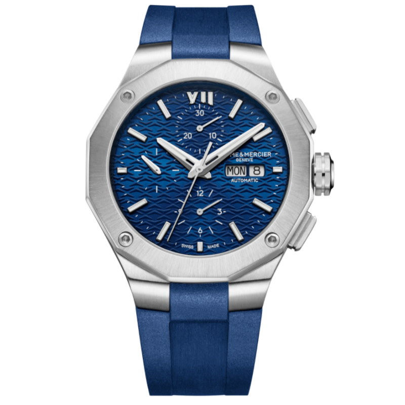 Baume & Mercier Riviera 10623 er et automatikk-ur til herre, 43mm, stålkasse, blå urskive med dag- og datovisning ved kl 3, kronograffunksjoner, safirglass, blå gummirem, 10 bar.