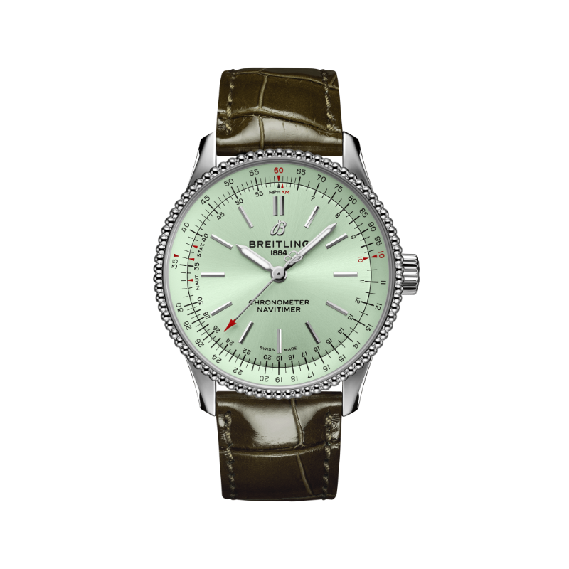 Breitling Navitimer armbåndsur, 35 mm, stål, krokodille skinnrem med foldespenne, mintgrønn skive med sølv Super-LumiNova® visere og røde detaljer, automatisk Breitling cal 17 verk, 38 timer gangreserve, dato, buet safirglass med tosidig antirefleksbehandling, 3 bar
