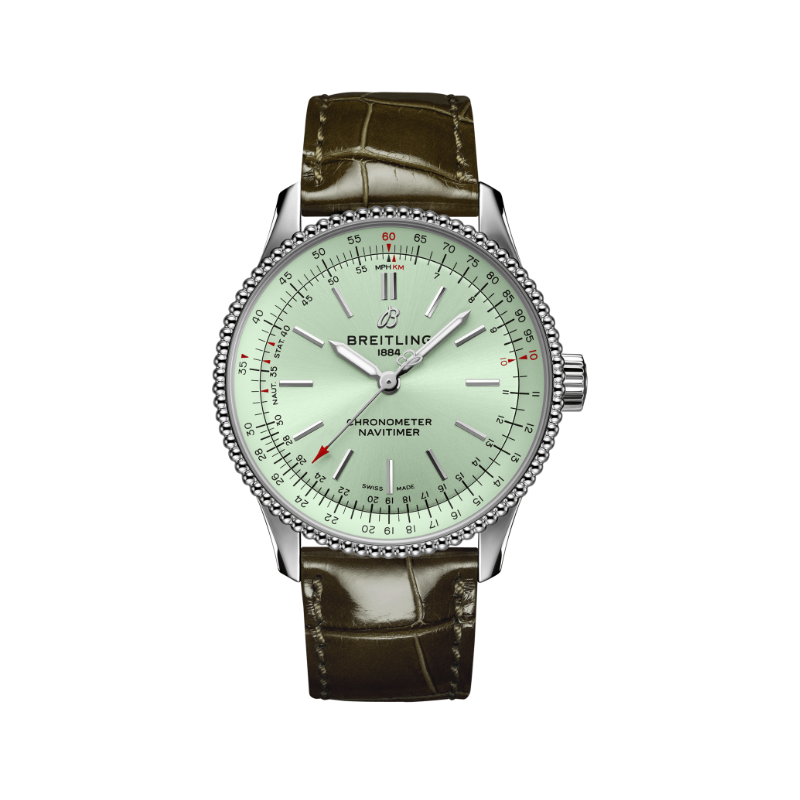 Breitling Navitimer armbåndsur, 35 mm, stål, krokodille skinnrem med klassisk spenne, mintgrønn skive med sølv Super-LumiNova® visere og røde detaljer, automatisk Breitling cal 17 verk, 38 timer gangreserve, dato, buet safirglass med tosidig antirefleksbehandling, 3 bar