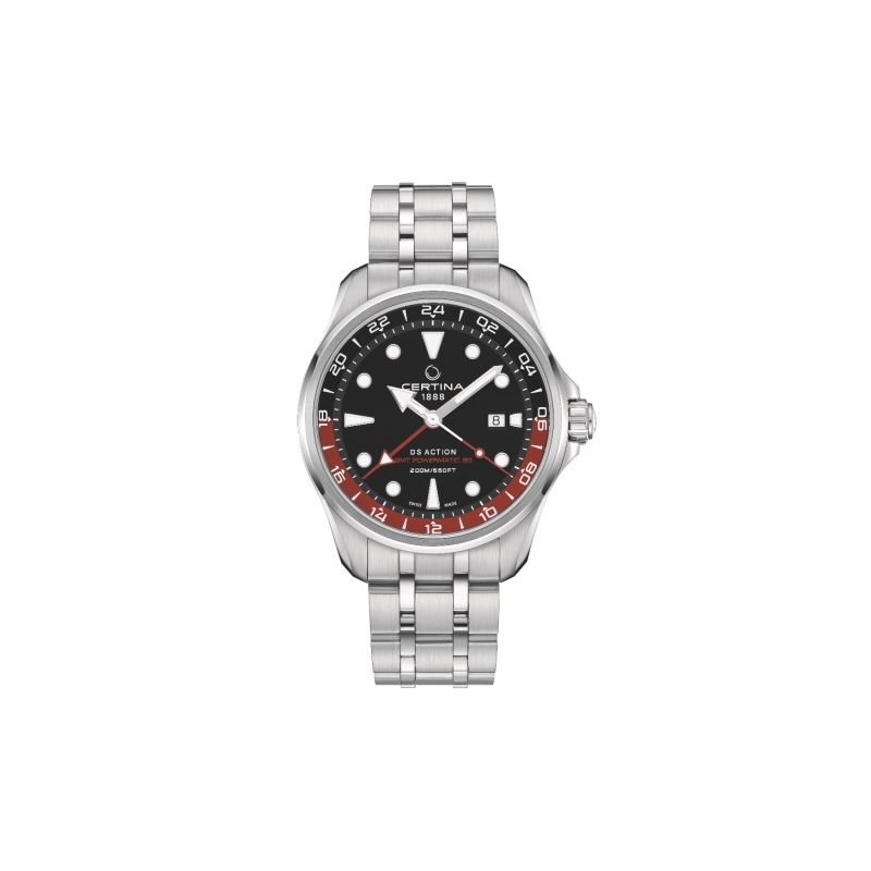 Certina DS Action GMT er et sporty og maritimt armbåndsur til herre, 43.1 mm, stål, lenke i med folderspenne, bezel, sort skive, visere i sentrum med Super-LumiNova® og datovisning på klokken 3, automatikk-urverk med 80 timer gangreserve, safirglass med antirefleksbehandling, 20 bar.