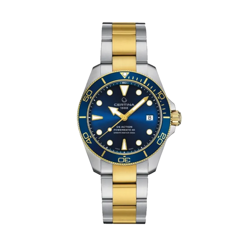 Certina DS Action er et dykkerur til dame, og er laget spesielt som en del av Certina sitt lange samarbeid med Sea Trutle Concervancy for beskyttelse av verdens hav og livet under overflaten, med hovedfokus på havskilpadder. Med en blå urskive og tofarget lenke i stål og gull PVD, er dette en elegant klokke som tåler en aktiv livsstil. Klokken har et automatikkverk hele 80 timer gangreserve og er lesbart under alle forhold takket være viserne med Super-LumiNova. Gravert med Sea Turtle Concervancy sin logo på baklokket og produsert i ett begrenset antall.