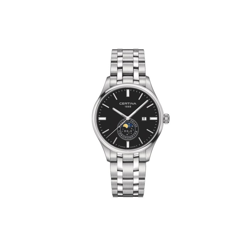 Certina DS-8 Moon Phase armbandsur til herre, 41mm, stål, lenke med foldespenne, sort skive med indekser og datovisning kl 3, sølv visere i Super-LumiNova, PrecidriveTM End of life Chronometer quartz-urverk, safirglass med antirefleksbehandling, 10 bar