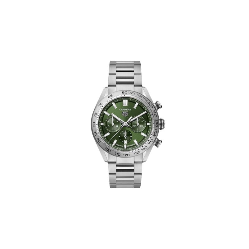 Tag Heuer Carrera er et sporty og elegant armbåndsur til herrer, 44 mm, grønn urskive, lenke, mekanisk urverk, 100m vanntetthet.