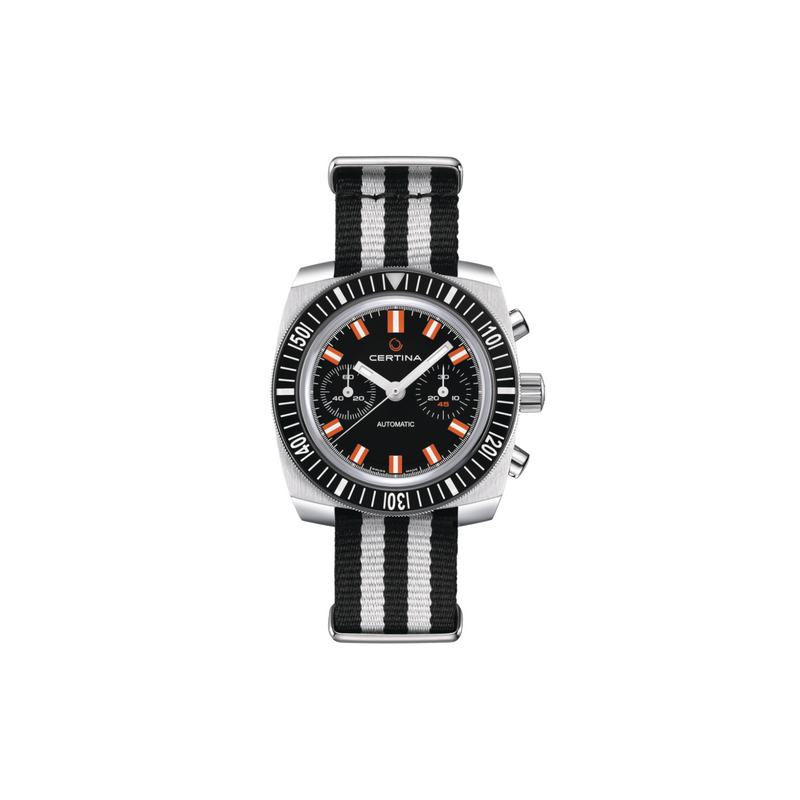 Certina DS Chronograph Automatic er et stilig 43,5 mm armbåndsur til herre med en sort skive som presenteres på en natorem. Klokken har safirglass med antireflekterende belegg. Vanntett ned til 200 meter.