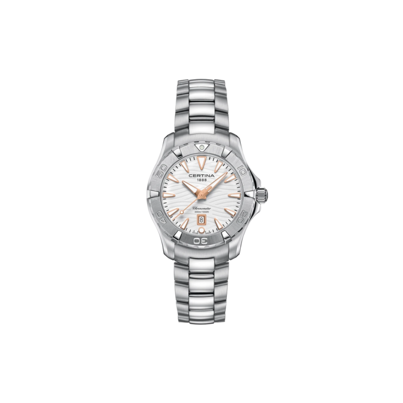 DS Action Lady lever opp til løftet om navnet sitt: Det COSC-sertifiserte kvartskronometeret kombinerer maksimal sveitsisk presisjon med vannmotstand opp til et trykk på 30 bar (300 meter). Klokken kommer med en hvit skive med safirglass med antirefleksjonsbehandling på begge sider.
