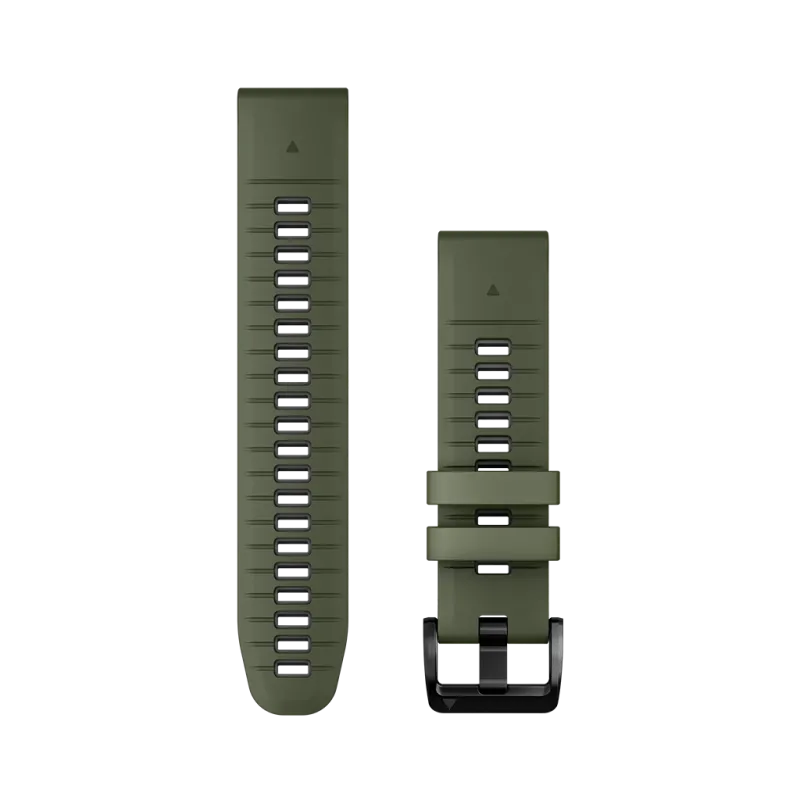 Denne moss-farget/grafittfarget silikonremmen passer for Garmin-modeller som har 22 mm i bredde mellom lugsene. Se spesifikke modeller under.