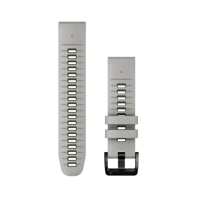 Denne tåkegrå/Moss-farget silikonremmen passer for Garmin-modeller som har 22 mm i bredde mellom lugsene. Se spesifikke modeller under.