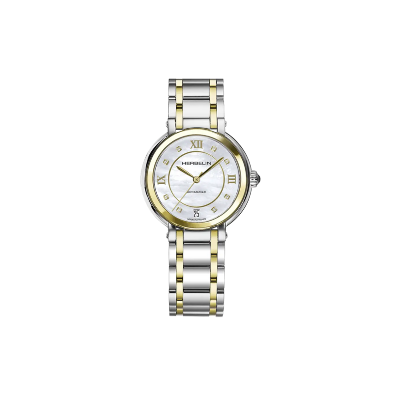 Herbelin Galet 33,5 mm med perlemorskive og romertall gjør dette til en delikat klokke. Kasse og lenke i stål og gull PVD. Klokken drives av et automatikkverk med opptil 38 timers gangreserve. Vanntett ned til 50 meter.