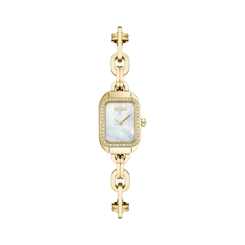 Hugo Boss Hailey Ladies er en tidløs dameklokke i gullfarget stål med luksuriøst preg. Den rektangulære urkassen på 28 mm er PVD-belagt og innrammet av glitrende detaljer som gir et smykkeaktig uttrykk. Den elegante champagnefargede urskiven i perlemor gir klokken et eksklusivt og feminint preg. Med quartz urverk, mineralglass og vanntetthet på 30 meter er dette en stilfull Hugo Boss dameklokke som passer perfekt både til hverdagsbruk og festlige anledninger.