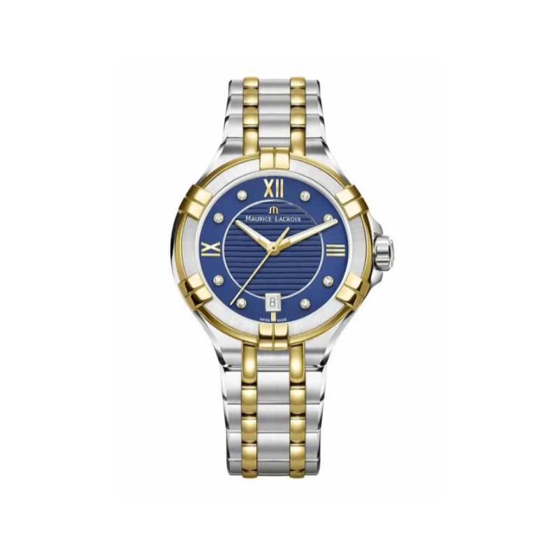 Maurice Lacroix Aikon armbåndsur til dame, 35 mm, stål og gulltonet, lenke med foldespenne, blå stripet skive med 8 diamanter og gull Super-LumiNova®-visere, sveitsisk quartz-verk, dato, safirglass, 10 bar