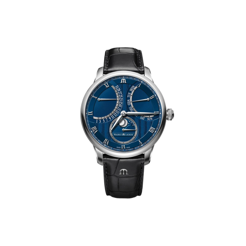 Maurice Lacroix Masterpiece Moonphase 43mm er et unikt ur som skiller seg ut. Dag- og datovisning, månefase, og sekundviser ved klokken 6. Blå urskive med romertall og en sort skinnrem. Vanntett ned til 100 meter.