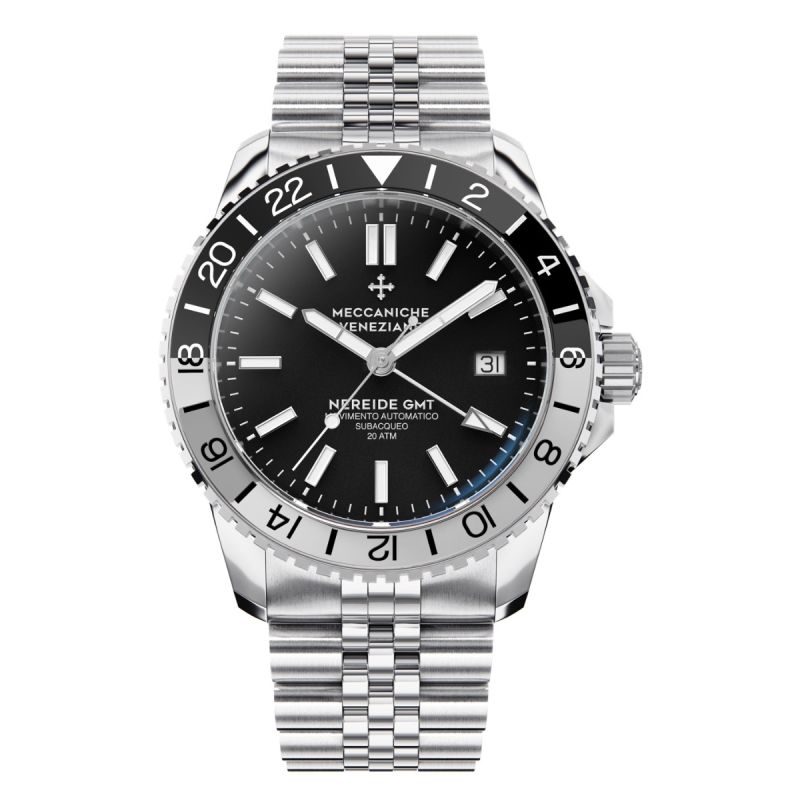 Meccaniche Veneziane Nereide GMT er et italiensk automatikk-ur til herre. 42mm, stållenke, stålkasse, sort urskive med visere og indekser i SuperLuminova, datovisning, dreibar sort/grå bezel, safirglass med antirefleks, 20 bar.