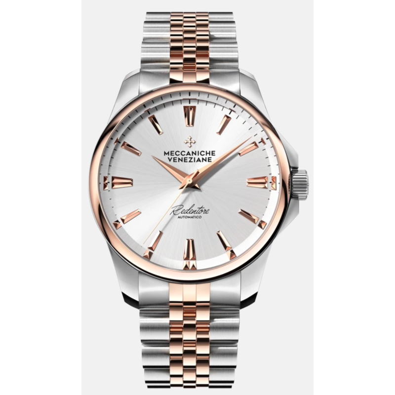 Meccaniche Veneziane Redentore 36mm, automatikk-ur til både dame og herre, kasse og lenke i stål/rosé, sølv urskive med visere og indekser i rosé, 10 bar.