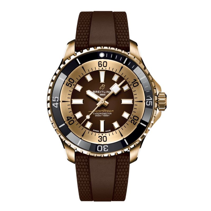 Breitling Superocean Automatic 44 Bronze - Brown. Brede visere og indekser i selvlysende Super-LumiNova® gir enkel lesbarhet under vann. Klokken er vanntett ned til 300 m (1000 fot), i tillegg til å være støt-, sand- og saltvannsbestandig. Urverket i klokken er Calibre Breitling 17. Klokken er i bronze og kommer med grønn gummireim. Kan brukes til alt; surf med den, svøm med den, bruk den ute, og bruk den til middag.