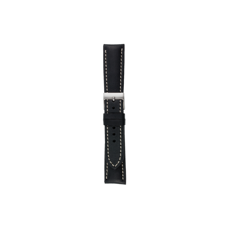 Pebro sort skinnrem med hvit søm i ytterkantene. Denne remmen har en lengde på 195 mm.