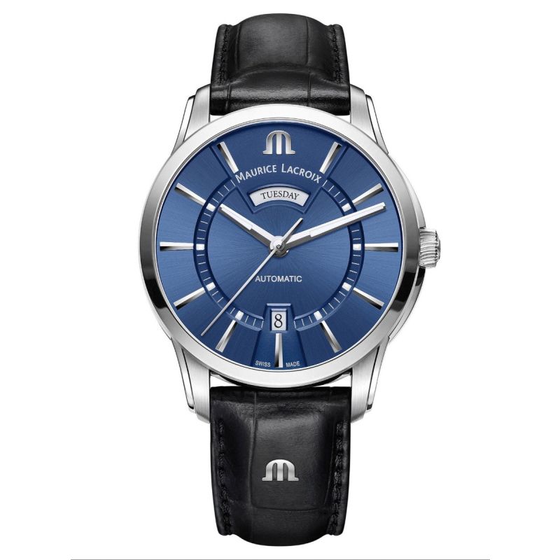 Maurice Lacroix Pontos armbåndsur til herre, 41 mm, stål, sort skinnrem med foldespenne, polert bezel, blå skive med sølv indekser og visere med Super-LumiNova®, automatisk ML143 urverk, 38 timer gangreserve, ukedag, dato, safirglass, glass baklokk, 10 bar