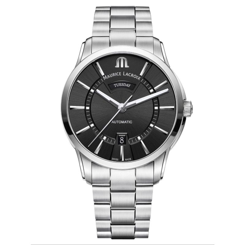 Maurice Lacroix Pontos armbåndsur til herre, 41 mm, stål, lenke med foldespenne, polert bezel, sort skive med sølv indekser og visere med Super-LumiNova®, automatisk ML143 urverk, 38 timer gangreserve, ukedag, dato, safirglass, glass baklokk, 10 bar