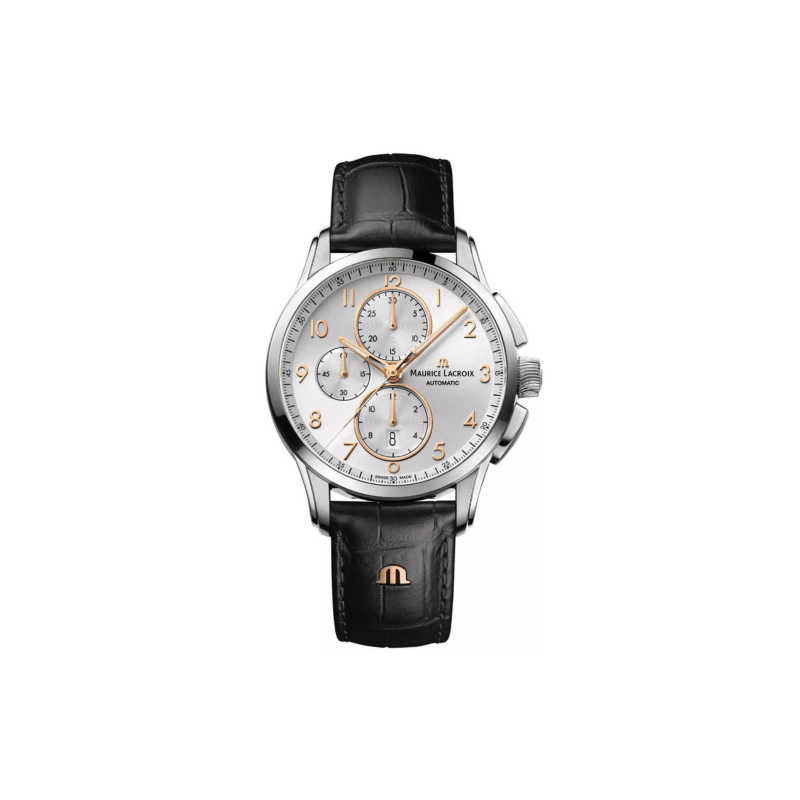 Maurice Lacroix Pontos 43 mm armbåndsur til herre i stål og sort skinnrem med foldespenne. Klokken har polert bezel og en sølv skive med rosé indekser og visere med Super-LumiNova®. Klokken drives av calibre ML112 som er et automatikkverk med 48 timer gangreserve. Vanntett ned til 100 meter.