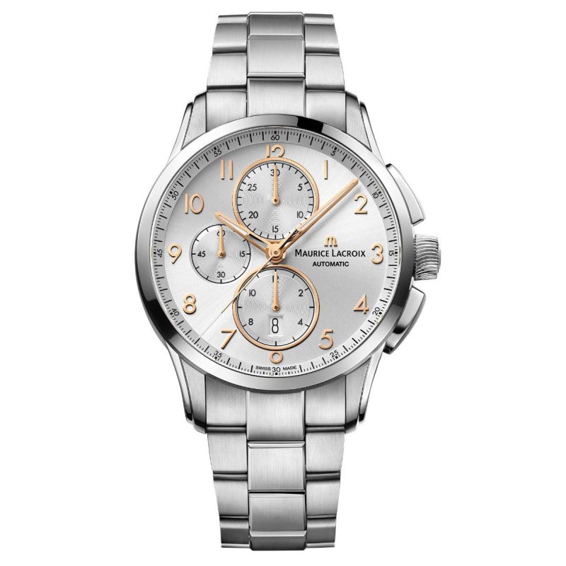 Maurice Lacroix Pontos armbåndsur til herre, 43 mm, stål, lenke med foldespenne, polert bezel, sølv skive med rosé tall og visere med Super-LumiNova®, automatisk ML112 urverk, 48 timer gangreserve, stoppeklokke, dato, safirglass, glass baklokk, 10 bar