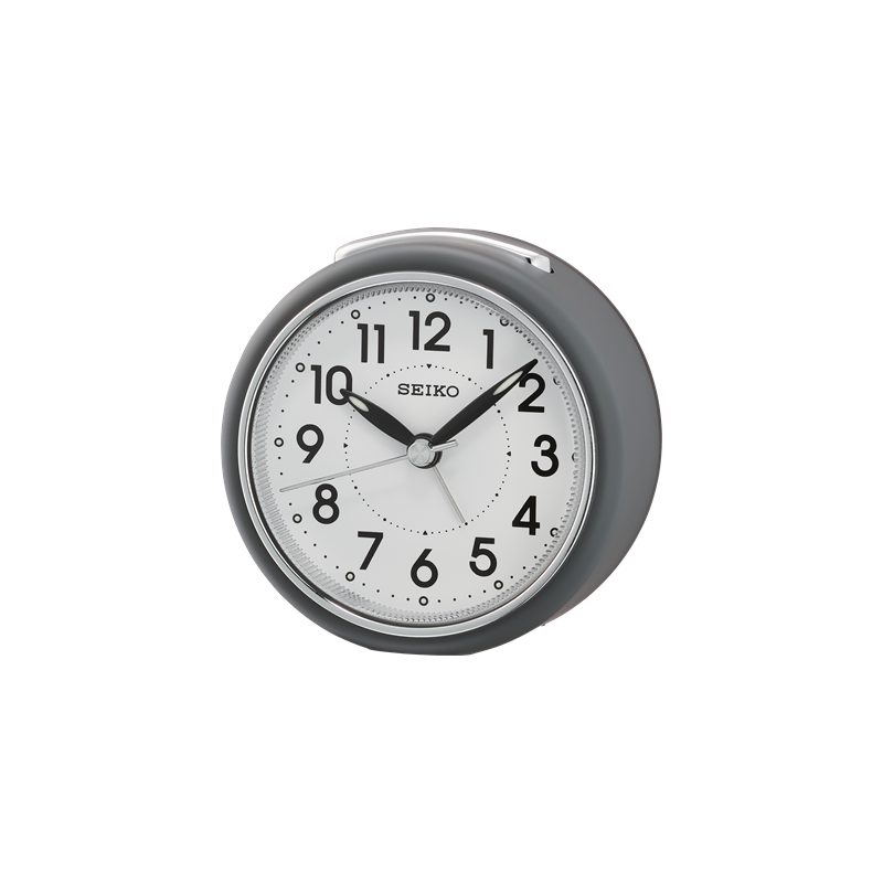 En klassisk vekkeklokke fra Seiko i matt grå, hvit urskive med tall og selvlysende visere, quarts urverk, alarm med Snooze funksjon.